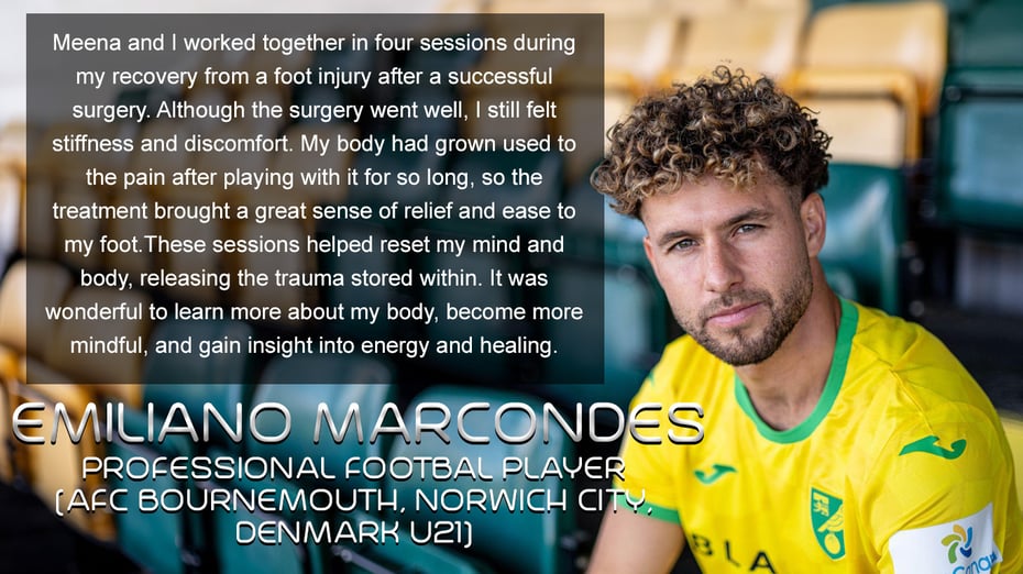 Meena is easily one of the most selfless, charismatic, kind, and caring people I have had the pleasure of working with. The first time I met Meena, I saw that she genuinely cared about helping others - whether that was through her professional work as an Energy Therapist or helping a complete stranger. She brings a warm and open presence that allows her to establish meaningful connections and is a wonderful compliment to her magical work in sessions as an Energy Therapist. My session with Meena put me in a very calm and relaxed state and allowed emotions to release from my body that had been hiding away for years. I cannot recommend Meena enough to athletes and professionals alike.