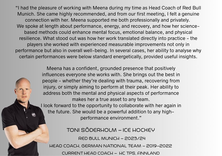 She helped me to get new energy and get all the negative feelings out of my body. Meena taught me how to draw in new energy in stressful situations and to keep negative thoughts and feelings away from me. As a result, I was suddenly able to achieve new physical best performances. It is also now possible for me to keep a calm and cool head in difficult situations both on and off the ice. She took the burden away from me to always question and analyse my actions. So I can live in the moment and focus on the essentials. As a result, I am now always present on the ice and intuitively make better decision without thinking.